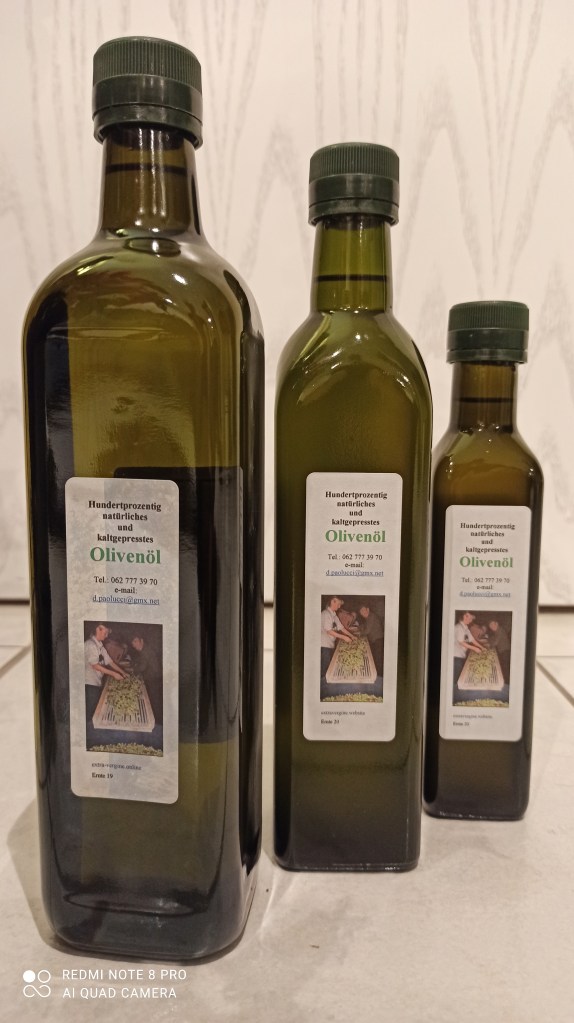 Das Öl wurde nur aus ungespritzten Oliven gewonnen, frei von jeglichen Konservierungsmitteln und sonstigen Zusätzen.
